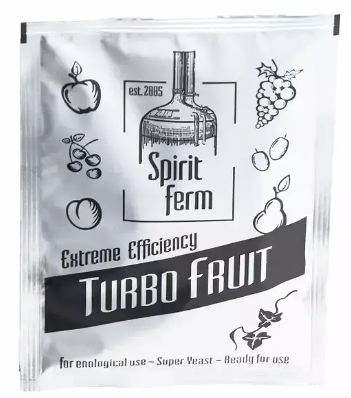 Фруктові турбо дріжджі Spirit Ferm Turbo FruitВиробник – ШвеціяОписФруктові турбо дріжджі Spirit Ferm Turbo Fruit призначені для приготування дистиляту з плодів та ягід, а також цукрового сусла. Дріжджі захищає надійна упаковка. Обирайте дріжджі Spirit Ferm Turbo Fruit, якщо для вас важливо отримати швидкий результат та зберегти аромат фруктової сировини. Мікро та макроелементи сприяють якісному бродінню, що дозволяє отримати ідеальний напій з приємним фруктовим ароматом. Використовуючи цей штам для зброджування цукрової браги, напій матиме кращі показники смаку та аромату.Процес ферментації протікає швидко - протягом 4-6 днів. Для отримання найкращих результатів підтримуйте постійну температуру.Турбо дріжджі Spirit Ferm Turbo Fruit здатні перебродити до 25 літрів ягідного або фруктового сусла. Міцність напою безпосередньо залежить від сировини, кількості глюкози, температурного режиму. Виробник заявляє про максимальну міцність 18%.ЗастосуванняДля приготування розчину потрібно налити 25 літрів фруктового соку при температурі 25-30°С. Дріжджі висипати на поверхню 0,5 л кип’яченої води, що схолонула до 30°С. Через 10 - 15 хвилин розчин води та дріжджів додати в основне сусло, попередньо збовтавши. Бродіння найкраще відбувається при 20 - 27°С, термін - до 7 днів.Використовуйте герметичний посуд з гідрозатвором, це попередить потрапляння кисню, а, отже, й скисання сусла. Харчову тару та гідрозатвор можна знайти у нас на сайті. В результаті використання фруктових турбо дріжджів Spirit Ferm Turbo Fruit ви отримаєте ароматний напій, що задовольнить смак кожного поціновувача.СкладДріжджі, поживні речовини, вітаміни, пектоензими.Характеристикиоптимальна температура бродіння - 20-27 °C;ідеальна температура бродіння - 25 °C;міцність - до 18 %;тривалість процесу бродіння - 4-6 днів;вага - 40 грам;форма - сухі.