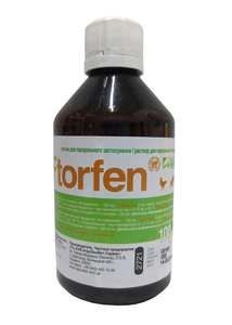 ФТОРФЕН РОЗЧИН розчин для перорального застосування Опис Прозорий розчин. Склад 1 мл препарату містить діючу речовину: фторфенікол 100 мг. Фармакологічні властивості Фторфенікол є похідним тіамфеніколу, в якому гідроксильна група заміщена на атом фтору, що обумовлює його антибактеріальну активність проти ацетилтрансферазосинтезуючих бактерій, які є чутливими до хлорамфеніколу. Це бактеріостатичний синтетичний засіб широкого спектру дії. Фторфенікол пригнічує синтез білків у клітинах бактерій. У протоплазмі він зв'язується з 70S-рибосомними субодиницями, в яких пригнічує ферментну активність пептидилтрансферази, і, такими чином, сповільнюючи синтез білка у рибосомах відповідних бактерій. Фторфенікол діє проти грампозитивних та грамнегативних бактерій, а саме Escherichia coli, Pasteurelia multocida, Salmonella spp., Haemophilus spp., Proteus spp., Staphylococcus spp., Streptococcus spp., Shigella spp., Klebsiella spp., Enterobacter spp., Actinobacillus pleuropneumoniae, Bordetella bronchiseptica, Mycoplasma hyopneumoniae, Mycoplasma hyorhinis, Salmonella cholerae suis, Streptococcus suis та ін. Застосування Кури: лікування птиці, хворої на коліінфекцію, стафілококову інфекцію, пастерельоз, а також при захворюваннях органів дихання, що спричинені чутливими до фторфеніколу мікроорганізмами. Свині: лікування тварин, хворих на плевропневмонію, атрофічний риніт, хворобу Гласера, а також при інших захворюваннях, що спричинені чутливими до фторфеніколу мікроорганізмами. Дозування Перорально з питною водою у дозі: Кури - для курчат віком до 4-х тижнів - 20 мг фторфеніколу на 1 кг м. т., або 100 мл препарату на 100 л питної води щодобово; для курей віком старше 4-х тижнів - 200 мл препарату на 100 л питної води щодобово. Курс лікування - 3-5 діб. Свині - 1,5-2 мг фторфеніколу на 1 кг м. т., що відповідає 1,5-2 мл на 100 кг м. т. тварини щодобово протягом 7 діб. Протягом лікування тваринам дають воду тільки з препаратом. Не слід давати тваринам будь-яку іншу воду для пиття. Якщо це неможливо, щоденна доза має бути розділена на два прийоми: першу половину дози препарату вводять вранці, другу - через 12 годин. Протипоказання Не застосовувати тваринам із підвищеною чутливістю до фторфеніколу, курям-несучкам, яйця яких призначені в їжу людям, а також поросним свиноматкам і у період лактації. Не застосовувати одночасно з тіамфеніколом або хлорамфеніколом. Препарат не слід вводити дорослим кнурам, призначеним для репродукції. Застереження Забій тварин на м'ясо дозволяється через 2 доби (кури) та 1 добу (свині) після останнього застосування препарату. До зазначеного терміну залежно від висновку лікаря ветеринарної медицини м'ясо згодовують непродуктивним тваринам або утилізують. При перемішуванні препарату у питній воді у концентрації вищій 1 г фторфеніколу на 1 л питної води активна речовина може випасти в осад. Форма випуску Флакони з темного скла або пластикові по 10мл, 100мл, 1 л. Зберігання Сухе темне, недоступне для дітей місце при температурі від + 5 °С до + 30 °С; після першого відкриття - при температурі від + 5 °С до + 25 °С. Термін придатності - 2 роки з дати виготовлення. Термін придатності після першого відкриття упаковки - 28 діб.