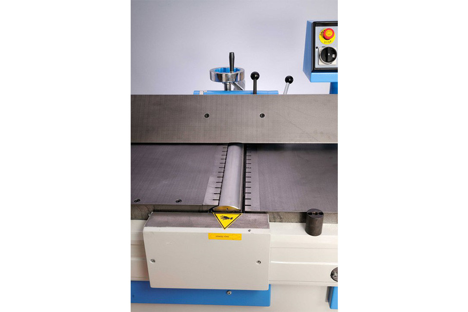 Установлена на станке. В отличие от стандартной линейки легко перемещается по мощной цилиндрической направляющей. Линейка не царапает стол за счет удобного и легкого перемещения на колесиках. Удобный наклон до 45° с выставлением по шкале позволяет снимать фаску под нужным углом. Гибкая защита закрывает ножевой вал за линейкой, что делает работу на станке еще более безопасной – норматив СЕ.
