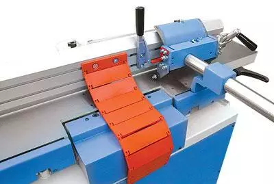 Установлена на станке. В отличие от стандартной линейки легко перемещается по мощной цилиндрической направляющей. Линейка не царапает стол за счет удобного и легкого перемещения на колесиках. Удобный наклон до 45° с выставлением по шкале позволяет снимать фаску под нужным углом. Гибкая защита закрывает ножевой вал за линейкой, что делает работу на станке еще более безопасной – норматив СЕ.