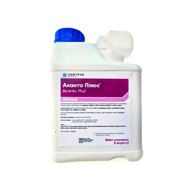 Фунгіцид Аканто Плюс – двокомпонентний фунгіцид на основі стробілурину з вираженим фізіологічним ефектом для захисту багатьох культур. Оброблені рослини цим фунгіцидом набагато краще переносять посуху або заморозки, а також більш стійкі до стресових умов, як біотичного, так і абіотичного походження і, таким чином, можуть використовувати всі свої сили для досягнення повноцінного врожаю.