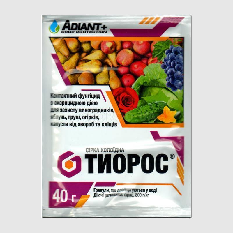 Фунгіцид Тіорос — порошок з акарицидними властивостями для захисту яблуні, груші, винограду, овочевих культур від борошнистої роси, сидіуму та кліщів. Активна речовина препарату — високоякісна сірка у формі гранул, які диспергуються. На відміну від колоїдної сірки Тіовіт Джет бездоганно розчиняється, утворюючи однорідну стійку суспензію, і добре утримується на обробленій поверхні. Вплив на шкідливий об'єкт з'являється в порушенні низки процесів життєдіяльності патогенних клітин завдяки виділенню сірки. Вага 40 г.