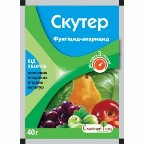 «Скутер» - новый фунгицид-акарицид контактного действия для защиты овощных и ягодных культур от мучнистой росы и плодовых деревьев от клещей. Характеризуется идеальной растворимостью в воде, однородный раствор хорошо удерживается на обработанной поверхности, и быстрым интенсивным действием. «Скутер» не фитотоксичен, не подавляет рост и развитие растений.