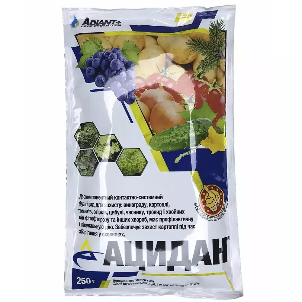 Ацидан — фунгицид контактно-системної дії. Призначений для захисту рослин від широкого спектра грибкових захворювань. Застосовується також для захисту бульб картоплі під час зберігання. Має і прискорювальні, лікувальні та захисні властивості. Ефективний навіть у випадках, коли рослина уражена на 5%. Крім того, завдяки наявності у своєму складі марганцю та цинку, стимулює фотосинтезу, підвищує опірність рослин до патогенів, сприяє формуванню потужного листового апарату. Препарат Ацидан швидко проникає в рослину та знищує грибкові спори, блокує розвиток міцелію. Період захисту — до двох тижнів. Фунгіцид стійкий до змивання обсадками. Не викликає резистентності. Не токсичний для птахів і бджіл.
