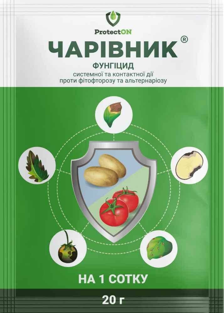 Фунгіцид Чарівник, що має контактні та системні властивості, використовується для обробки посівів різних агрокультур з метою запобігання та лікування грибкових захворювань. У складі даного препарату знаходяться три активні компоненти: металаксил, манкоцеб та диметоморф, кожен з яких належить до різних хімічних категорій, визначаючи їх різноманітні способи взаємодії з патогенами. Металаксил виступає в ролі системного фунгіциду, демонструючи захисні та лікувальні якості, особливо щодо несправжніх борошнисторосяних грибів і кореневих гнилей. Даний компонент проникає в рослину, розподіляючись по всіх її частинах. Манкоцеб діє як контактний фунгіцид, забезпечуючи захист поверхні рослини, не проникаючи у його внутрішні шари. Він не дозволяє патогенам проникати всередину і, навіть якщо вони все ж таки потраплять на рослину, манкоцеб пригнічує їх активність, порушуючи їх життєво необхідні процеси та запобігаючи поширенню. Диметоморф, маючи системні характеристики, ефективний проти ооміцетів, особливо проти збудників мілд'ю винограду та фітофтори на томатах та картоплі. Він викликає ефект, що перешкоджає формуванню спор. Три компоненти у складі Чарівника взаємодіють синергічно, запобігаючи можливому розвитку стійкості патогенів до препарату. Захисні властивості препарату зберігаються до двох тижнів. Фунгіцид Чарівник ефективно застосовують для захисту картоплі, томатів, винограду, огірків, цибулі, ріпаку та інших агрокультур проти фітофторозу, мілдью, альтернаріозу, пероноспорозу, та багатьох інших захворювань.