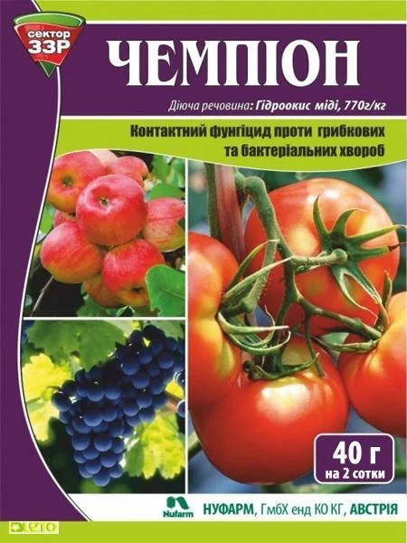 Фунгіцид Чемпіон — високоефективний профілактичний засіб для захисту яблунь, винограду та томатів від більшості грибкових захворювань: