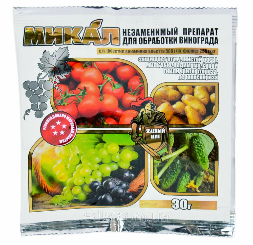 Фунгіцид контактно-системної дії для захисту виноградників від мільдью, сірої гнилі, оїдіуму, борошнистої роси та іншими хворобами. Діюча речовина: фоцетил алюмінію альетта 500г/кг, фолпет 250г/кг Препаратная форма: порошок, що змочується. Призначення: препарат контактно-системної дії для застосування на виноградній лозі і овочевих культурах для захисту від комплексу захворювань. Механізм дії: Микал – контактно-системний фунгіцид захисної та частково лікувальної дії. Фосетил алюмінію швидко проникає всередину рослини і переміщується з низхідним і висхідним потоком; посилює імунітет рослини і блокує проростання грибних спор. Фолпет залишається в поверхневих тканинах оброблених рослин і викликає плазмолиз, а потім розпад міцелію патогена. Швидкість впливу: завдяки високій швидкості проникнення в рослину дія препарату настає в перші години після застосування. Фітотоксичність: проведені численні випробування препарату Мікал в рекомендованих нормах витрати не виявили випадків прояву фітотоксичності по відносинам до оброблюваних культур. Селективність: Микал володіє досить високою вибірковістю дії. Токсикологія: препарат має 3 клас небезпечності (помірно небезпечний в-во). Препарат не фітотоксичний при використанні в суворій відповідності з рекомендаціями. Препарат малоопасен для бджіл (3 клас небезпеки). Дозволяється застосування препарату у санітарній зоні рибогосподарських водойм. Заходи безпеки: при роботі з препаратом необхідно застосування засобів індивідуального захисту шкірних покривів, очей та органів дихання (захисні окуляри, респіратор або ватно-марлева пов'язка, гумові рукавички, халат бавовняний, головний убір). Обробку слід проводити у відсутність дітей і тварин. Для приготовления рабочего раствора не использовать пищевую посуду. Во время работы не пить, не курить, не принимать пищу. После работы вымыть лицо и руки с мылом, прополоскать рот. Освободившуюся тару закопать вдали от жилых построек. Упаковки запрещается выбрасывать в канализацию и места сбора бытового мусора, оставлять на поверхности почвы и бросать в водоемы. Первая помощь: удалить загрязненную одежду. При вдыхании обеспечить пострадавшему покой и приток свежего воздуха, в случае необходимости искусственное дыхание. При попадании на кожу: снять загрязнения ватой или куском ткани, обмыть кожу большим количеством воды с мылом. При попадании в глаза: промыть большим количеством проточной воды. При случайном проглатывании: выпить несколько стаканов воды с активированным углем (1 г/кг массы тела) и принять солевое слабительное (20г сернокислой магнезии на полстакана воды). При всех случаях отравления обратиться к врачу. Лечение симптоматическое, антидот отсутствует. Хранение: хранить в сухом прохладном месте, отдельно от пищевых продуктов и лекарств, в местах, не доступных для детей и домашних животных. Температура зберігання від -30 С до +30 С. Спосіб застосування: у відповідності з нормативами, кількість препарату розвести в невеликій кількості води, а потім, помішуючи, додати воду, що залишилася. Обприскувати рослини свіжоприготовленим розчином у суху безвітряну погоду, рівномірно змочуючи листя. Нормативи: для винограду від мильдьи, борошнистої роси, оїдіуму, сірої гнилі обприскування в період вегетації робочим розчином (витрата до 3 л/100 