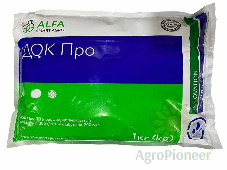 Док Про благодаря активным веществам (цимоксанил и миклобутанил) обладает чрезвычайным лечебным действием. Уничтожение патогена происходит даже через 1-3 дня после заражения за счет капсулирования инфицированных клеток растения. Высокая растворимость действующих веществ обеспечивает быстрое распространение фунгицида по растению и быстрый «стоп-эффект».