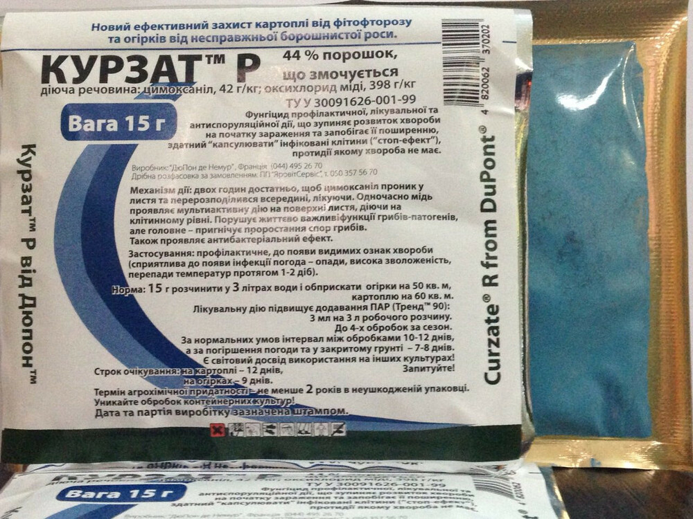 Курзат Р — високоефективний двокомпонентний фунгіцид. Має контактні та системні властивості. Призначений для профілактичного захисту та лікування рослин від різних захворювань. Активні речовини — хлорокис міді + цимоксаніл.