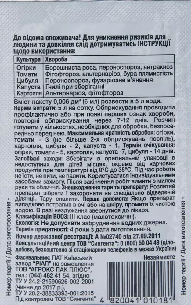 - Ефективний проти 4 класів грибів: Ascomycetes, Basidiomycetes, Deuteromycetes, Oomycetes;