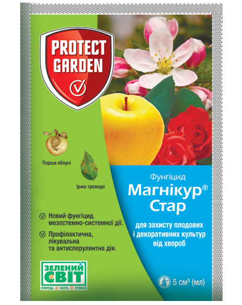 Магнікур Стар - фунгіцид системної дії, що містить у своєму складі діючу речовину, яка ідеально доповнює одна одну і завдяки цьому забезпечує сильний системний захист від різноманітних збудників хвороб. Наприклад, проти плодової гнилі, борошнистої роси та парші на яблуках, а також проти борошнистої роси та іржі троянд.