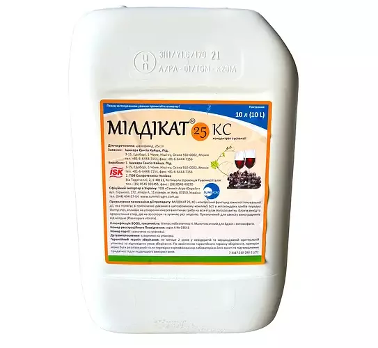 МІЛДІКАТ призначений для захисту столового та технічного винограду від мілдью протягом всього періоду вегетації. Препарат впливає на утворення енергії в клітинах збудника.