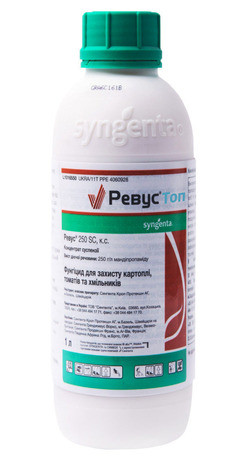 Ревус Топ високоефективний двокомпонентний системний фунгіцид. Призначений для профілактики та лікування різних захворювань рослин. Активні речовини — мандипропамід і дифеньйоназол, потрапивши через листя в рослину, мігрують по ній і в місцях грибкової інфекції пригнічують ріст міцелії, проростання й утворення спор. Фунгіцид абсорбується восковим шаром аркуша та тривалий час не змивається водою або опадками.