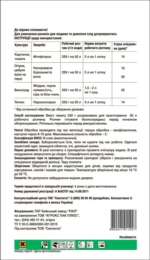 Першу обробку потрібно проводити до початку розвитку хвороби, але не пізніше змикання картоплі, томатів та огірків в рядках; винограду - від закінчення цвітіння, але не пізніше початку визрівання. Обприскування після ураження призводить до зменшення захисної дії. Останнє обприскування слід проводити до припинення активного росту стебла, тобто відразу після закінчення цвітіння картоплі, томатів та огірків. Не слід проводити обприскування за 2-3 години перед дощем.