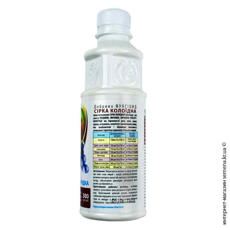 Сірка колоїдна (фунгіцид) - для захисту плодових, овочевих, квіткових культур та винограду від борошнистої роси, кіли, парші, оідууму, антракнозу, аскохітозу та рослинних кліщів. Має профілактичні та лікувальні властивості, запобігає багатьом хворобам і не дає їм розвиватися.
