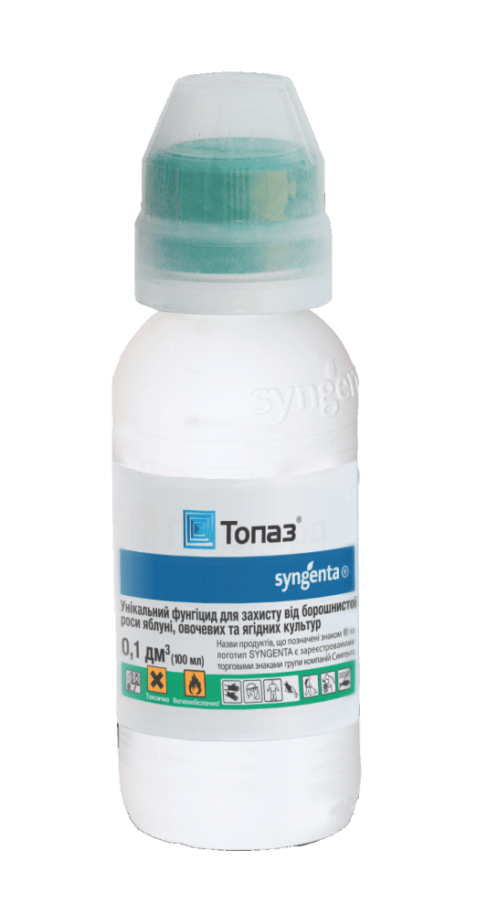 Топаз — системний фунгіцид для захисту винограду, плодово-ягідних, овочевих і декоративних культур від справжньої борошнистої роси та інших грибкових захворювань.Фунгіцид має як профілактичні, так і лікувальні властивості (навіть за високого інфекційного шару). Має тривалий лікувальний вплив — 10-14 днів. Профілактична — до 8 тижнів.