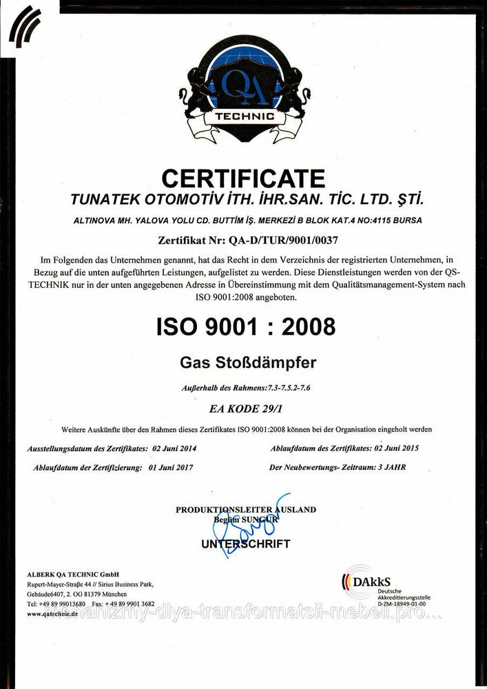 Турецкие газовые амортизаторы TGS разработаны по высоким качествам стандартов, используються экологически чистые материалы.  Товар сертифицирован в соответствии с DIN ISO 9001:2008.