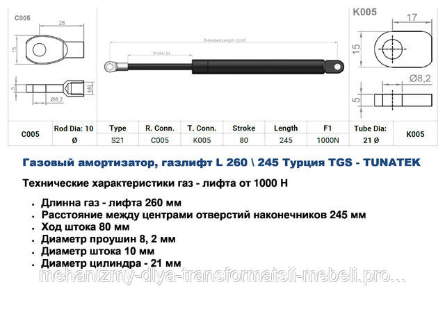 Газ-лифт L 260 мм 1000 н Турция TGS
