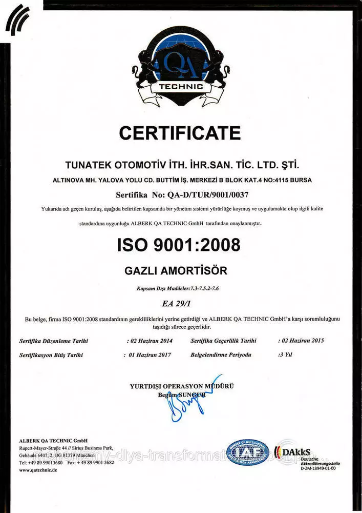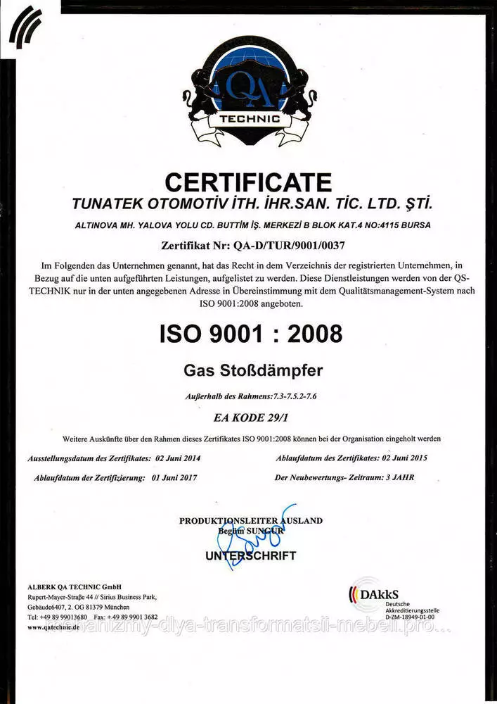 Турецкие газовые амортизаторы TGS разработаны по высоким качествам стандартов, используються экологически чистые материалы.  Товар сертифицирован в соответствии с DIN ISO 9001:2008.