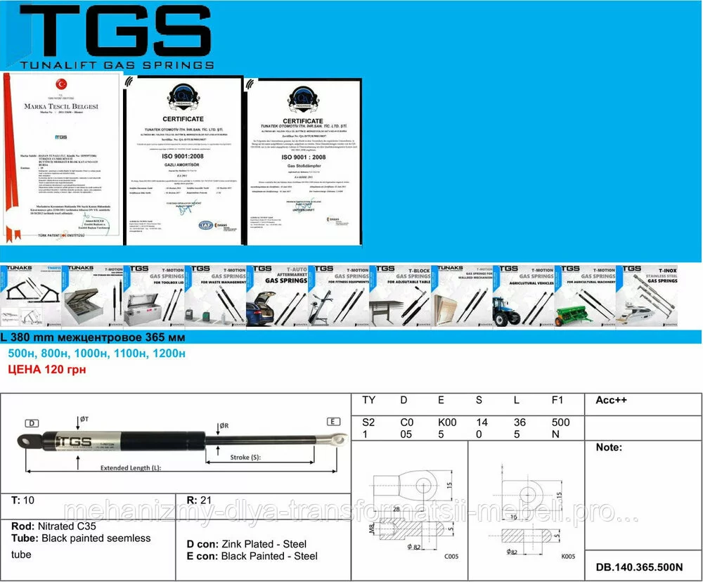 Газовый амортизатор, газлифт 365 мм,L 380, 300 н 500н 800н 1000н 1200н Турция TGS - TUNATEK