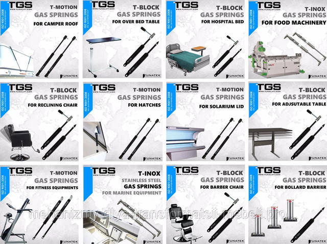 Возможно изготовление газ лифтов длинной от 100мм до 2000мм с усилием от 10 N до 10000 N , 8 видов