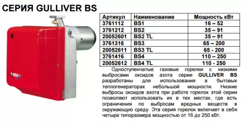 Одноступенчатые горелки с низкими выбросами оксидов азота (Low NOx) GULLIVER BS разработаны для использования в бытовых теплогенераторах небольшой мощности. Низкие выбросы оксидов азота при работе горелок этой серии позволяют использовать их в тех местах, где есть ограничения по выбросам вредных веществ в окружающую среду. Эта серия горелок включает в себя четыре типоразмера мощностью от 16 до 250 кВт.