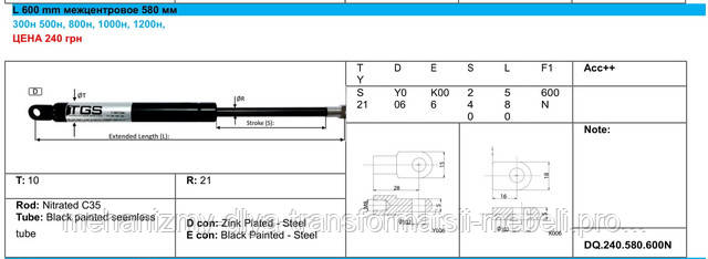 Газовый амортизатор, газлифт L 600\580  Турция TGS - TUNATEK
