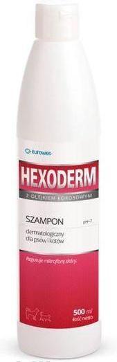 Hexoderm з хлоргексидином і кокосовою олією для собак і котів - дерматологічний знезаражуючий шампунь з хлоргексидином і кокосовою олією для регулювання мікрофлори шкіри у собак та котів. Призначається для стабілізації pH шкіри, поліпшення її стану та догляду під час лікування шкірних запалень.