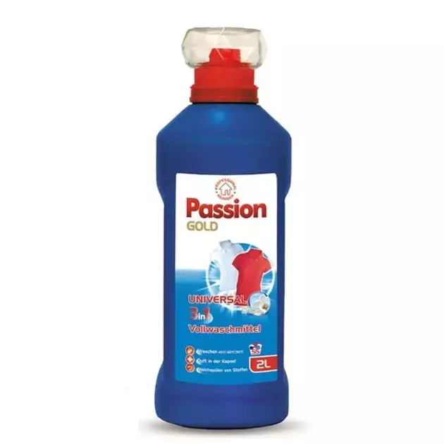 Гель для прання Passion Gold з Німеччини. Підходить для прання чорного, білого і кольорового білизни. Завдяки своїй формулі гель дуже ефективно справляється з плямами, при цьому кольору на вашому білизна зберігаються яскравими. Делікатну тканина ви можете прати навіть у холодній воді. Режим температури прання білизни від 15 С до 90 с