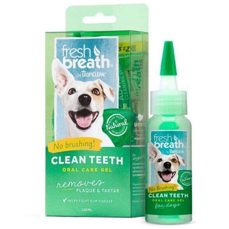 TropiClean Fresh Breath Oral Care Clean Tee Gel for Dogs підтримує здоров’я порожнини рота вашої собаки та дарує їй свіже дихання – чистити зуби не потрібно! Цей смачний гель зі смаком м’яти допомагає безпечно та ефективно видалити наліт і зубний камінь, освіжаючи подих. Для максимального захисту від неприємного запаху з рота та зубів використовуйте разом із розчином TropiClean Fresh Breath Dental Health Solution.