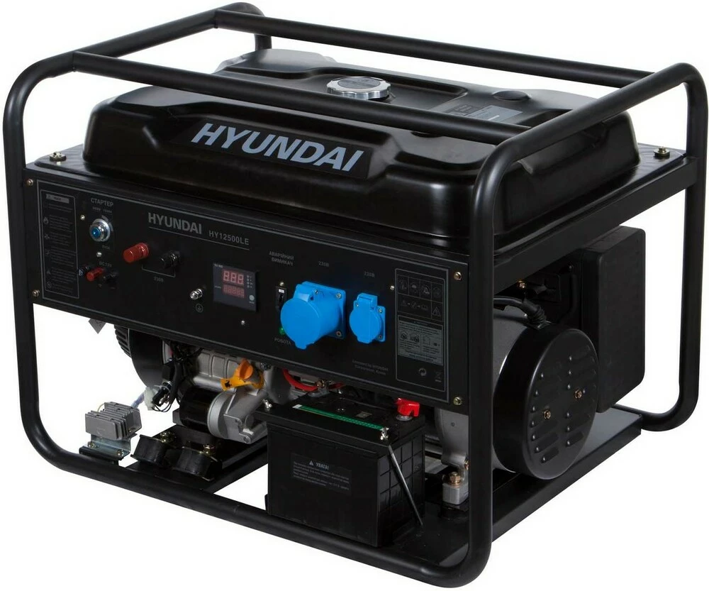 камера згоряння до 680 куб. см, що дозволило досягнути потужності  21 к.с;Використання якісних матеріалів в поєднанні з надійною системою фіксації клапанів, що гарантує надійну та довговічну роботу двигуна;Надійний масляний насос завжди забезпечує бездоганне змащування поршневої групи;Високоякісний комбінований повітряний фільтр забезпечує надійну фільтрацію повітря для утворення паливної суміші.Альтернатор - усі генератори Hyundai комплектуються тільки синхронними альтернаторами з мідною обмоткою. Обмотка з міді не перегрівається, витримує більші навантаження у порівнянні з іншими матеріалами, володіє відмінною струмовіддачею. Виготовляються на автоматичній лінії, що унеможливлює присутність дефектів пов’язаних з людським фактором, також застосовано поліпшене укладання проводів з додатковою фіксацією обмоток та якісною лаковою заливкою проводів. Балансування ротора проводиться під динамічним навантаженням на високоточному обладнанні із застосуванням електронної системи вимірювання симетрії.Також в дизельних генераторах даної серії використана система подвійного захисту обмоток альтернатора від перевантаження. Наявний альтернатор гарантовано віддає номінальну потужність 9кВт, та має запас по короткочасному над вантаженню до 15%.Панель керування генератора - повністю оновлений багатофункціональний цифровий дисплей є не тільки інформаційним, а в першу чергу виконує функцію надійного захисту генератора від перевантажень, та захищає під’єднані до генератора споживачів, від таких неприємностей як, стрибки напруги, струму, частоти, навіть попереджує користувача про низький заряд акумулятора.На панелі керування встановлено:1. Цифровий дисплей нового покоління надає інформацію про:напругу (V);струм (А);частоту (Hz);загальні мотогодини;стан акумулятора.1.1 Захист - новий цифровий дисплей захищає від:Перевантаження;Надвисого струму;Відхилення частоти (високої чи низької);Відхилення напруги (високої чи низької);Відхилення напруги акумулятора (високої чи низької).2. Силові контакти для підключення повного навантаження потужністю 11,5кВт (для 400В) 3. Для  380В - розетка 400В/32А та розетка 230В/16А;4. Вихід 12 V (з тепловим запобіжником від перевантаження);5. Замок запалення;6. Тепловий захист звичайної розетки (16А);7. Вихід для під’єднання заземлення;8. Кнопка аварійної зупинки двигуна;9. Кнопка ввімкнення свічки розжарення;Усі генератори проходять тестування стабільності роботи при температурі від -25°С до 30°С.Місткий, сталевий бензобак - резервуар для палива виготовлений з високоміцного металу. Він вміщує 55 л, а цього досить для 22,5 години генерування в разі 50 % навантаження.КомплектаціяГенератор;Паспорт;Гарантійний талон;Ключ;Вилка підключення;Клеми підключення 12 V.