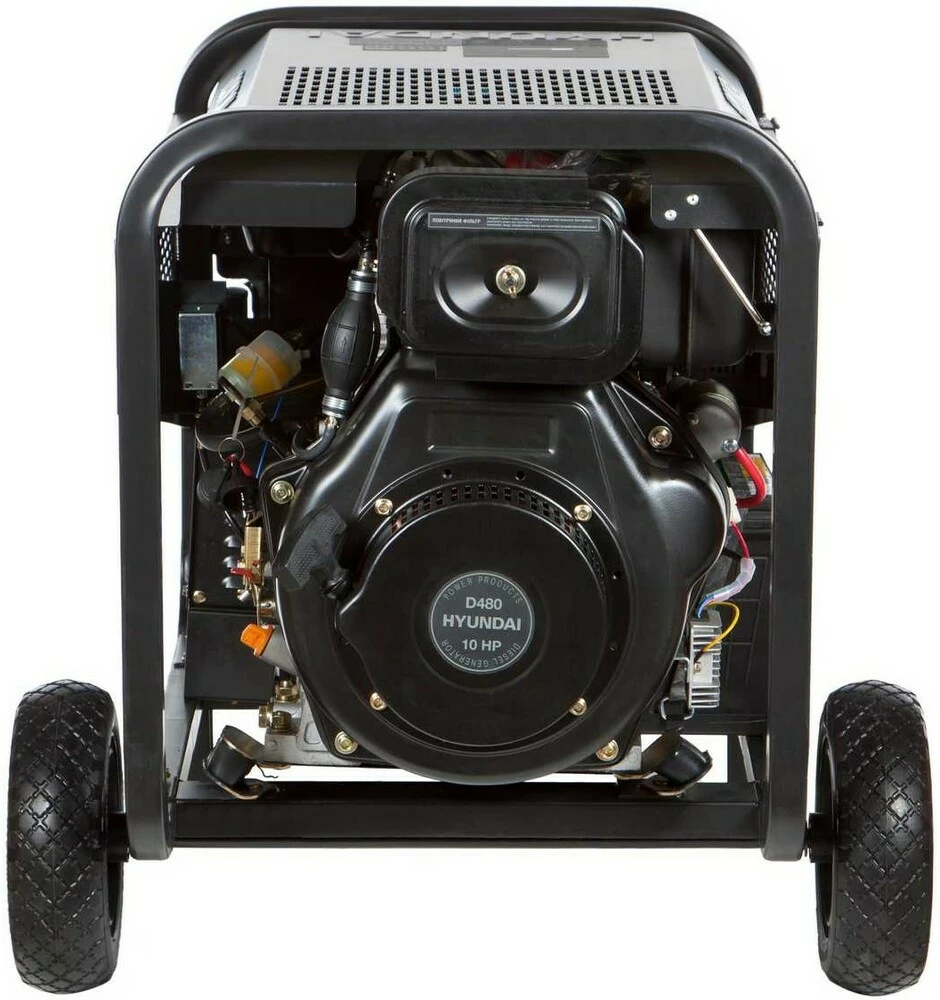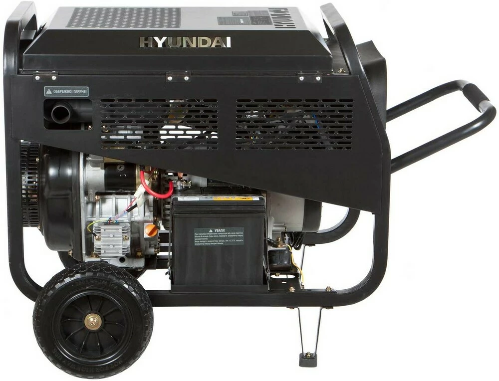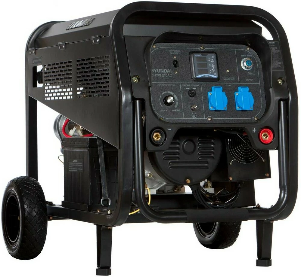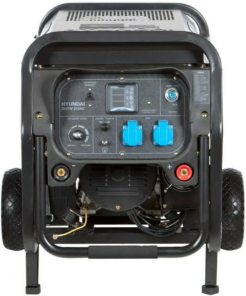 Призначення генератора Hyundai DHYW 210AC:Модель Hyundai DHYW 210AC генератора може використовуватися в якості резервного апарату, як для електродугового зварювання, так і джерела резервного електроживлення, для електроінструментів та електроприладів.Генератор може забезпечити електроживлення газового котла (0,5 кВт), холодильника (0,7 кВт), пральної машини (1 кВт) та ін.Особливості генератора Hyundai DHYW 210ACДвигун: чотиритактний. Ручний/електричний запуск.Оснащений датчиком контролю рівня мастила.Економічність: витрати палива становлять - 0,9 літрів на годину.Рама: В основі конструкції лежить трубчаста рама, яка забезпечує захист агрегату генератора, зручне перенесення і просту установку на будь-яку поверхню, в тому числі й нерівну.Дана модель оснащена колесами і ручками, що дозволяє легко переміщувати генератор по Вашій ділянці або об'єкті.Синхронний альтернатор: Для стабілізації вихідної напруги генератора Hyundai DHYW 210AC використовується синхронний альтернатор. Коливання вихідної напруги згладжуються в межах +-1%. Мідна обмотка генератора забезпечує:підвищений ресурс експлуатації;максимальну віддачу струму;відсутність надмірного нагрівання при роботі.Панель управління: інтуїтивно проста, доступна недосвідченому користувачеві. На ній виведені: кнопка запуску генератора, основні показники роботи (лічильник відпрацьованого часу (мотогодини)), розетки - 2 шт. по 16 ампер, клеми на 12В для зарядки акумуляторів, запобіжник на розетки, заземлення.Переваги моделі Hyundai DHYW 210ACПереваги моделі генератора Hyundai DHYW 210AC з дизельним двигуном:Експлуатація в будь-яку погоду: роботі генератора не заважають люті морози, висока температура повітря і вологість навколишнього середовища.Підвищений рівень безпеки: електричні проводи і кабелі надійно ізольовані. Заземлення корпусу апарату захищає від ураження електричним струмом. Система аварійного відключення убезпечить генератор від перегріву при роботі на максимальних навантаженнях.Простота експлуатації: модель генератора Hyundai DHYW 210AC призначена для професійного використання. З управлінням нею впорається навіть користувач без досвіду.Мобільність: відносно компактні розміри конструкції генератора та невелика вага дозволяють швидко і легко переміщувати по заміській ділянці або будівництві.Багатофункціональність: дана модель укомплектована зварювальним генератором, що дозволяє використовувати зварювання для Ваших потреб. Крім того, до даної моделі Ви можете підключити різні електроприлади та електроінструменти, і навіть підключити ваш будинок, об'єкт - все, що завгодно, в рамках потужності генератора.Довгий ресурс компонентів: генератор зібраний на спеціалізованому заводі з дотриманням світових стандартів якості. Рама має антикорозійне покриття. Довговічність силового агрегату забезпечує система повітряного охолодження.Комплектація моделі Hyundai DHYW 210AC:Генератор;Ключ запалювання;Акумулятор;Запобiжник;Керівництво по експлуатації.Трансортувальний комплект