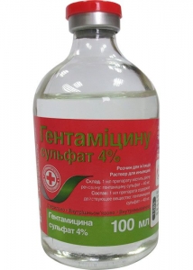 Гентаміцину сульфат 4% Опис Прозора, безбарвна або ледь жовтувата рідина. Склад 1 мл препарату містить діючу речовину: гентаміцину сульфат - 40 мг. Фармакологічні властивості Гентаміцин належить до групи аміноглікозидів. Він активний до грамнегативних та грампозитивних мікроорганізмів: Escherichia coli, Salmonella spp. Shigella spp., Enterobacter aerogenes, Klebsiella spp., деяких видів Proteus spp. тa Serratia spp., Pseudomonas aeruginosa, Pasteurella multocida, Staphylococcus aureus, Serpulina hyodysenteriae, Mycoplasma spp. На чутливі клітини гентаміцин діє в кількох напрямках: вплив на цілісність цитоплазматичної мембрани, вплив на метаболізм РНК; пригнічення синтезу білка на рівні ЗОs рибосомальної субодиниці. Застосування Лікування великої рогатої худоби, коней, овець, кіз, свиней, собак та котів, хворих на септицемію, артрит, а також при захворюваннях травного каналу, органів дихання і сечостатевої системи та шкіри, що спричинені мікроорганізмами, чутливими до гентаміцину. Дозування Внутрішньом'язово 2 рази на добу з інтервалом 10-12 годин протягом 3-5 діб у наступних дозах: велика рогата худоба - 0,5-1мл препарату на10 кг м. т.; коні, вівці, кози, свині - 0,5-1 мл препарату на10 кг м. т.; собаки, коти - 1,1 мл препарату на 10 кг м. т. Новонародженим тваринам протягом перших днів життя дають половину рекомендованої дози. Протипоказання Підвищена чутливість до гентаміцину. Не застосовувати тваринам із порушеною функцією нирок, органів слуху та рівноваги. Не застосовувати одночасно з іншими аміноглікозидними антибіотиками та антибіотиками, що мають нефротоксичну дію (поліміксин В, колістин, амфотерицин, хлорамфенікол, цефалоспорини, ритроміцином), а також з міорелаксантами та анестезуючими засобами, сульфаніламідами, гепарином, вітамінами групи В, сечогінними засобами (фуросемід). Застереження Забій тварин на м'ясо та застосовування молока в їжу людям дозволяється, відповідно, через 7 та 3 доби після останнього застосування препарату Отримані, до зазначеного терміну, м'ясо та молоко утилізують або згодовують непродуктивним тваринам, залежно від висновку лікаря ветеринарної медицини. Вагітним та лактуючим тваринам препарат дають у випадках крайньої необхідності. Довготривале лікування препаратом може призвести до нефротоксичної та ототоксичної дії. Форма випуску Флакони із скла, закриті гумовими корками та алюмінієвими ковпачками під обкатку по 10, 20, 50 та 100 мл. Зберігання Сухе темне, недоступне для дітей місце, при температурі від + 15"С до + 25"С. Термін придатності - 2 роки з дати виготовлення. Після першого відбору із флакона препарат використати протягом 14 діб, за умови зберігання в темному місці при температурі від + 2°С до + 8°С.