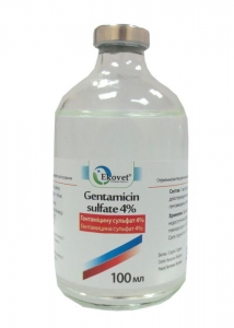 Гентаміцину сульфат 4% Опис Прозора, безбарвна або ледь жовтувата рідина. Склад 1 мл препарату містить діючу речовину: гентаміцину сульфат - 40 мг. Фармакологічні властивості Гентаміцин належить до групи аміноглікозидів. Він активний до грамнегативних та грампозитивних мікроорганізмів: Escherichia coli, Salmonella spp. Shigella spp., Enterobacter aerogenes, Klebsiella spp., деяких видів Proteus spp. тa Serratia spp., Pseudomonas aeruginosa, Pasteurella multocida, Staphylococcus aureus, Serpulina hyodysenteriae, Mycoplasma spp. На чутливі клітини гентаміцин діє в кількох напрямках: вплив на цілісність цитоплазматичної мембрани, вплив на метаболізм РНК; пригнічення синтезу білка на рівні ЗОs рибосомальної субодиниці. Застосування Лікування великої рогатої худоби, коней, овець, кіз, свиней, собак та котів, хворих на септицемію, артрит, а також при захворюваннях травного каналу, органів дихання і сечостатевої системи та шкіри, що спричинені мікроорганізмами, чутливими до гентаміцину. Дозування Внутрішньом'язово 2 рази на добу з інтервалом 10-12 годин протягом 3-5 діб у наступних дозах: велика рогата худоба - 0,5-1мл препарату на10 кг м. т.; коні, вівці, кози, свині - 0,5-1 мл препарату на10 кг м. т.; собаки, коти - 1,1 мл препарату на 10 кг м. т. Новонародженим тваринам протягом перших днів життя дають половину рекомендованої дози. Протипоказання Підвищена чутливість до гентаміцину. Не застосовувати тваринам із порушеною функцією нирок, органів слуху та рівноваги. Не застосовувати одночасно з іншими аміноглікозидними антибіотиками та антибіотиками, що мають нефротоксичну дію (поліміксин В, колістин, амфотерицин, хлорамфенікол, цефалоспорини, ритроміцином), а також з міорелаксантами та анестезуючими засобами, сульфаніламідами, гепарином, вітамінами групи В, сечогінними засобами (фуросемід). Застереження Забій тварин на м'ясо та застосовування молока в їжу людям дозволяється, відповідно, через 7 та 3 доби після останнього застосування препарату Отримані, до зазначеного терміну, м'ясо та молоко утилізують або згодовують непродуктивним тваринам, залежно від висновку лікаря ветеринарної медицини. Вагітним та лактуючим тваринам препарат дають у випадках крайньої необхідності. Довготривале лікування препаратом може призвести до нефротоксичної та ототоксичної дії. Форма випуску Флакони із скла, закриті гумовими корками та алюмінієвими ковпачками під обкатку по 10, 20, 50 та 100 мл. Зберігання Сухе темне, недоступне для дітей місце, при температурі від + 15"С до + 25"С. Термін придатності - 2 роки з дати виготовлення. Після першого відбору із флакона препарат використати протягом 14 діб, за умови зберігання в темному місці при температурі від + 2°С до + 8°С.