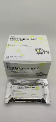 ГЕОМІЦИН ВЕТ (піноутворюючі таблетки для внутрішньоматкового застосування) Опис Таблетки жовтого кольору продовгуватої форми з гладкою однорідною поверхнею. Склад 1 таблетка (19 г) містить діючу речовину: окситетрацикліну гідрохлорид – 1,0 г Допоміжні речовини: крохмаль кукурудзяний, кислота винна, натрію гідрокарбонат, желатин, поліоксиетиленовий ефір, діетаноламід жирних кислот кокосового масла, магнію стеарат, тальк. Фармакологічні властивості АТС – vet класифікаційний код: QG51АА01 – протимікробні та антисептичні ветеринарні препарати для внутрішньоматкового застосування. Окситетрациклін. Окситетрациклін є бактеріостатичним антибіотиком, механізм дії якого полягає у пригніченні синтезу білка при його взаємодії з рибосомами, а також у зменшенні проникливості цитоплазматичної мембрани чутливих мікроорганізмів. Володіє широким спектром дії проти грамнегативних та грампозитивних мікроорганізмів, а саме: Clostridium spp., Actinomyces pyogenes, Staphylococcus spp., Streptococcus spp., E. coli, Actinobacillus pleuropneumoniae, Haemphilus spp., Pasteurella spp., Klebsiella spp., Campylobacter spp., Bacillus spp., Brucella spp., Moraxella spp., Salmonella spp. Він також активний проти мікоплазм (Mycoplasma spp.), рикетсій (Rickettsia spp.), хламідій (Chlamydia) та деяких найпростіших. Завдяки піноутворюючій основі, діюча речовина таблеток рівномірно розподіляється по слизовій оболонці матки. Виділяється двоокис вуглецю, підсилює резорбцію окситетрацикліну, сприяє проникненню його в більш глибокі шари ендометрію. Біотрансформація тетрациклінів обмежена і, як правило, близько третини даної дози виводиться у незміненому вигляді. Приблизно 60 % дози виводиться шляхом клубочкової фільтрації, причому 40 % препарату виводиться з калом. Тетрацикліни також виводяться з молоком; найвища концентрація досягає піку через 6 годин після парентеральної дози, а його сліди виявляють до 48 годин. Застосування Профілактика гінекологічних захворювань та лікування корів, кобил, свиноматок при запальних процесах в матці після родової допомоги, оперативного відділення посліду, абортів, при ускладнених і патологічних родах, при гострих післяродових ендометритах. Дозування Препарат застосовують внутрішньоматково. Перед застосуванням препарату проводять санацію зовнішніх статевих органів, при необхідності звільняють порожнину матки від запального ексудату при його великій кількості (особливо при гнійно- катаральних ендометритах) шляхом промивання фізіологічним розчином. На руку надягають рукавичку для ректальної фіксації шийки матки і обережно через шийку вводять таблетку в порожнину матки. З профілактичною метою препарат застосовують одноразово по 1 таблетці. Для лікування бактеріальних гінекологічних захворювань використовують 1 - 2 таблетки на тварину з інтервалом 48 годин. Протипоказання Не застосовувати тваринам, які мають підвищену індивідуальну чутливість до окситетрацикліну. Застереження Забій тварин на м'ясо та споживання молока в їжу людям дозволяється, відповідно, через 10 та 4 доби після останнього застосування препарату. Отримане до зазначеного терміну м'ясо та молоко утилізують або згодовують непродуктивним тваринам, залежно від висновку лікаря ветеринарної медицини. Форма випуску Пакети з алюмінієвої фольги, які містять 1 таблетку та пакетик з силікагелем, упаковані по 10 штук у картонну коробку. Зберігання Сухе, темне, недоступне для дітей місце