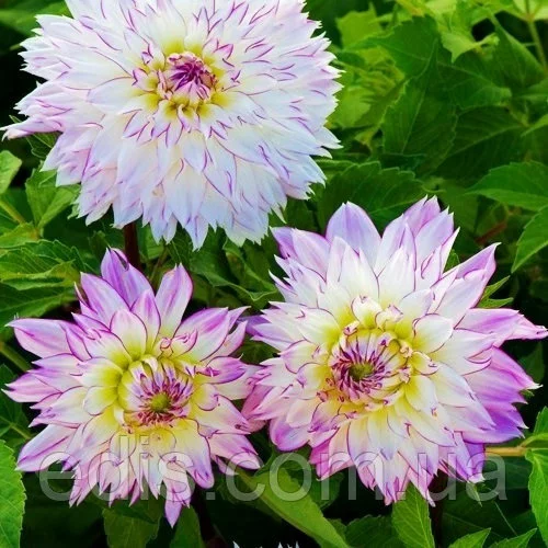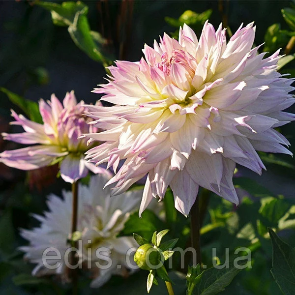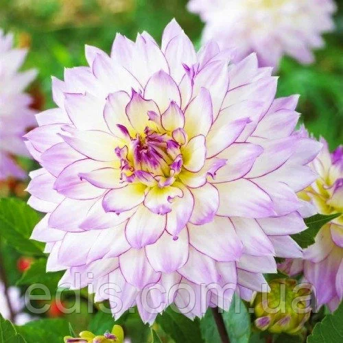 Декоративна жоржина Crasy Love відрізняється ніжним забарвленням. Її білі пелюстки обведені бузковим відтінком. Пуп'янок розкривається поступово, тому центр квітки залишається бузковим.