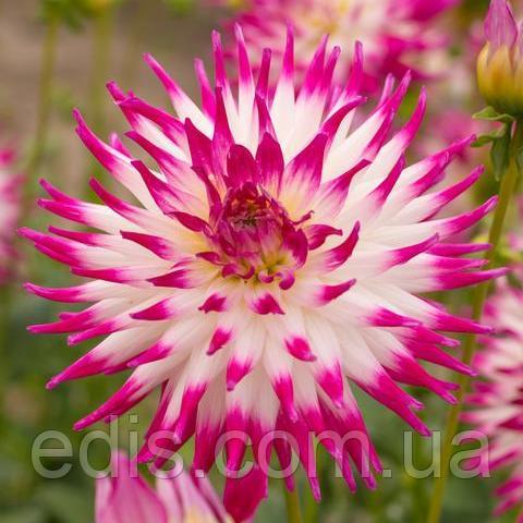 Георгина кактусовая Dutch Explosion – это один из новых сортов, который не оставит равнодушным никого, кто решит заняться его выращиванием. Соцветия собраны из белых лепестков, которые свернуты в трубочку, кончики окрашены в розовый цвет. Оригинальный окрас и нежный аромат ценят в этом цветке садоводы и флористы.