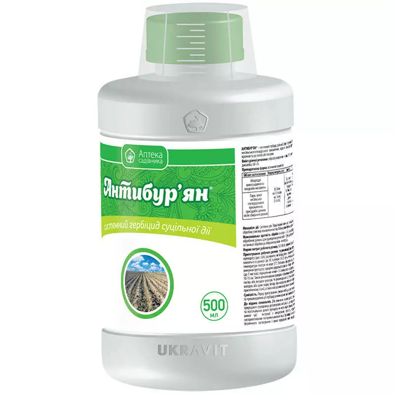 Антибур`ян - системний гербіцид суцільної дії для знищення однорічних та багаторічних бур’янів на полях після збирання урожаю, а також на парах та землях несільськогосподарського призначення.