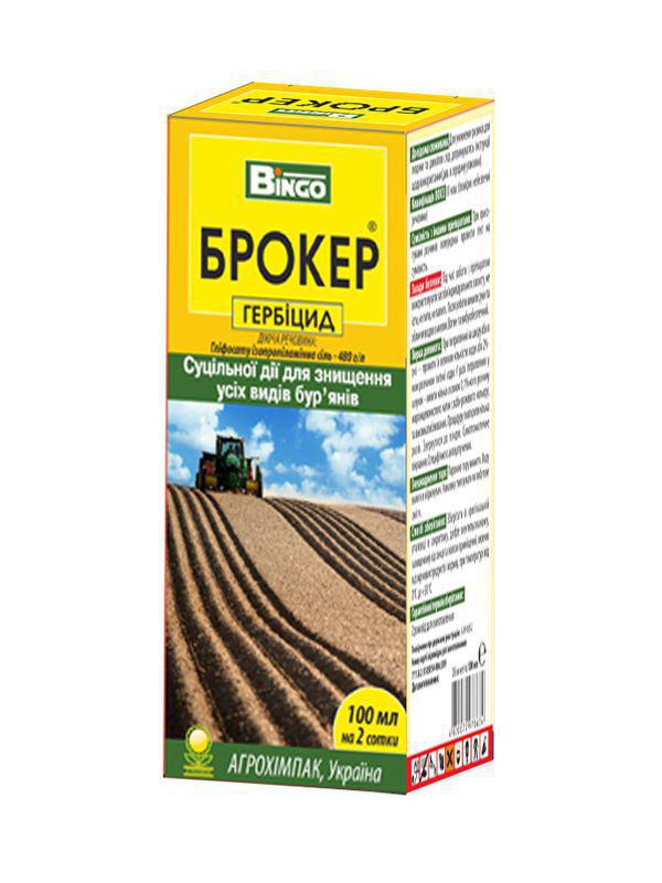 Брокер — универсальный довсходовый системный гербицид сплошного действия. Применяется для тотального уничтожения различных сорняков — злаковых и двудольных, однолетних и многолетних. Используется на полях и огородах, предназначенных для выращивания сельскохозяйственных культур. Гербицид считается одним из самых стойких к различным погодным условиям и самым безопасным для человека и окружающей среды. Не смывается осадками. Действующее вещество — глифосата изопропиламинная соль. Препарат Брокер, обладая системным действием, в течение 4-6 часов поглощается сорной культурой, распределяется по всему растению и нарушая синтез аминокислот и белков, блокирует процессы деления клеток. Таким образом, прекращается рост сорняков и происходит отмирание всех частей растения. Первые признаки увядания становятся заметными на 3-5 день, а полная гибель сорняков наступает через 2-3 недели. Препарат Брокер не накапливается в почве.