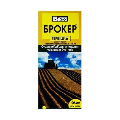 Брокер — універсальний досходовий системний гербіцид суцільної дії. Застосовується для тотального знищення різних бур'янів — злакових і дводольних, однорічних і багаторічних. Використовується на полях і городах, призначених для вирощування сільськогосподарських культур. Гербіцид вважається одним з найбільш стійких до різних погодних умов і самим безпечним для людини і навколишнього середовища. Не змивається опадами. Діюча речовина — гліфосату ізопропіламінна сіль. Препарат Брокер, маючи системною дією, протягом 4-6 годин поглинається смітної культурою, розподіляється по всій рослині і порушуючи синтез амінокислот і білків, блокує процеси поділу клітин. Таким чином, припиняється ріст бур'янів і відбувається відмирання всіх частин рослини. Перші ознаки в'янення стають помітними на 3-5 день, а повна загибель бур'янів настає через 2-3 тижні. Препарат Брокер не накопичується в грунті.