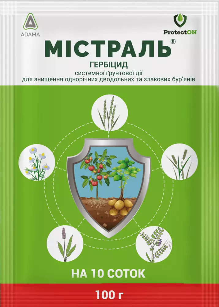 Гербіцид Містраль, ProtectON – ефективний препарат для захисту від бур'янів молодих посадок томатів та картоплі. Засіб селективної дії не завдає шкоди основній культурі, знищує тільки бур'яни, блокуючи в них процес фотосинтезу. Ефективний проти однорічних дводольних і злакових бур'янів, серед них горошок посівний, різні види ромашки, гірчак, мишій, пирій повзучий. Щоб уникнути малоефективних підробок, варто купити гербіцид Містраль у нашому інтернет-магазині, що гарантує справжність гербіцидних препаратів.