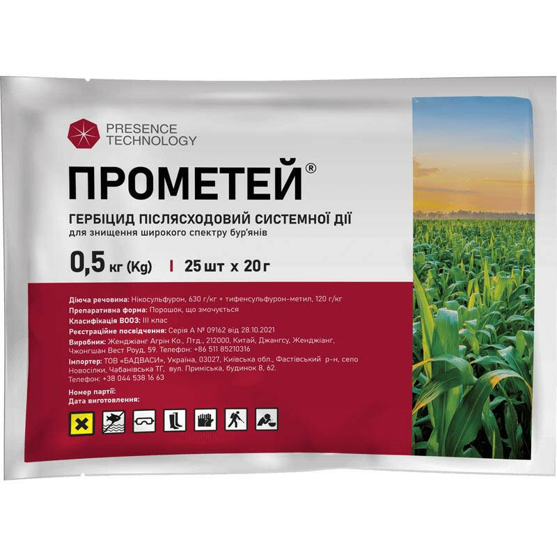 Прометей системний післясходовий гербіцид, призначений для боротьби з однорічними та багаторічними злаковими та дводольними бур'янами у посівах кукурудзи.