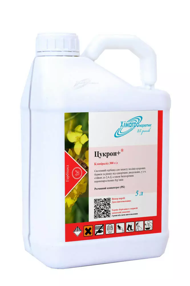 Цукрон+ - системний гербіцид проти всіх бур'янів родини айстрових, бобових і пасльонових, а також проти всіх видів осоту, польовий берізки і ін. Надійно захищає посіви цукрових буряків, зернових, колосових, кукурудзи, ріпаку та інших с / г культур.