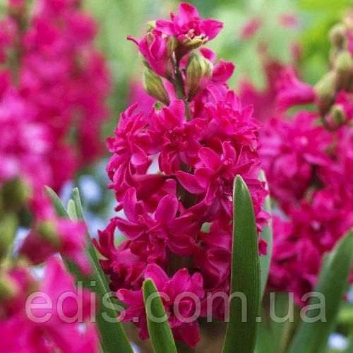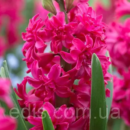 Гіацинт махровий Red Diamond Ред Даймонд (в перекладі - Червоний Діамант) - найяскравіший і популярний сорт з махрових гіацинтів. Махрові гіацинти відрізняються від простих тим, що кожний окремий квіточка в суцвітті - окремий шедевр. Посадковий матеріал махрових сортів коштує набагато дорожче звичайних, тому їх дуже рідко продають квітучими. Гіацинт - універсальний квітка. Його легко вирощувати і на клумбі, і в горщиках. Цвітуть серед зими ароматні, яскраві гіацинти в горщиках - прекрасний подарунок. Ціна готових до цвітіння гіацинтів в горщиках досить висока. Якщо у вас є холодний балкон або підвал, де можна в холоді і темряві тримати горщики з цибулинами гіацинтів для вкорінення - купуйте в нашому інтернет-магазині цибулини гіацинтів та інших весняних цибулинних квітів і виростите свою весняну клумбу самостійно! Заходьте влітку і восени в розділ