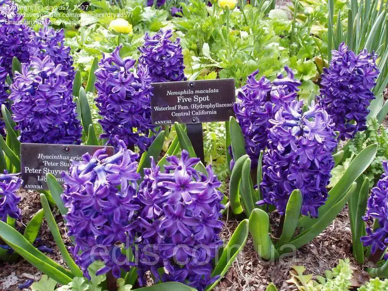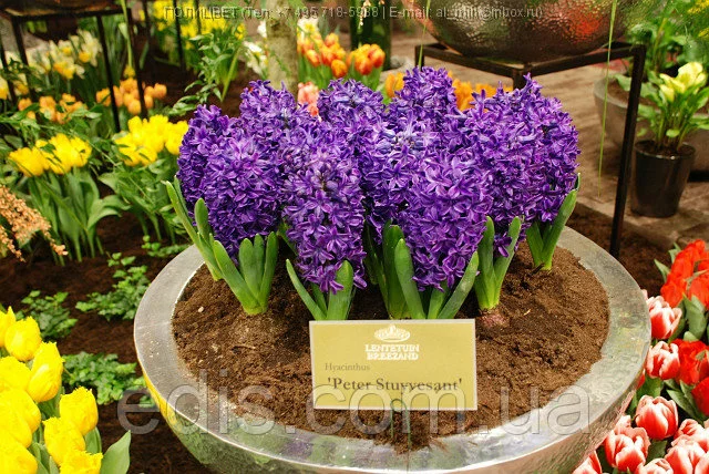 Гіацинт східний великоквітковий Пітер Стівесен (Peter Stuyvesant) Пітер Стівесант – старий, перевірений сорт гіацинтів. На сонці забарвлення лілово-фіолетове, у похмурий день цей гіацинт виглядатиме темнішого, насиченого чорнильно-фіолетового кольору. Висота рослини 25-30 см. Висота суцвіття 12-15 см.