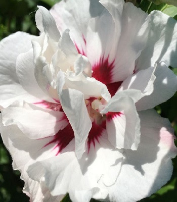 Відрізняється неймовірною красою, невибагливістю і витривалістю. Дуже ефектний і красивий сорт з махровими білосніжними квітами із невеликим бордовим червоним вічком в центрі, яке розходиться бордовими променями по всіх пелюстках. Листя зелене. Особливих вимог до грунту немає. Морозостійкий. Він вигідно виглядатиме на клумбах, прибудинкових ділянках, уздовж бордюрів і не тільки, в якості живоплоту, в одиночних і змішаних посадках.