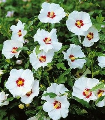 Це справжня знахідка для вимогливого садівника! Ціниться за невеличкі червоні плями біля основи пелюсток, що створюють чудовий контраст із сніжно-білими пелюстками. А смужки, що розходяться від нерівних країв обрамлення створюють неповторний візерунок (квіти до 11 см в діаметрі). Віддає перевагу плодючим ґрунтам. Чудово виглядає у композиціях з гібіскусами інших кольорів та як солітер посеред звичайного газону.