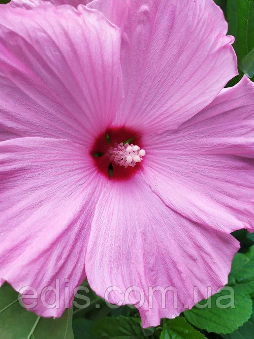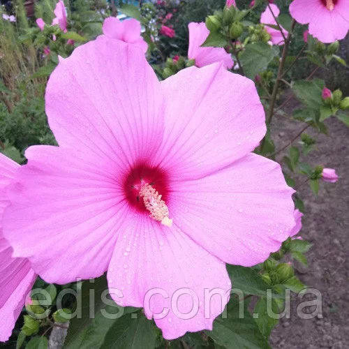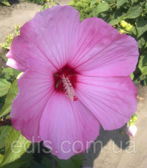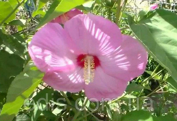 С середины лета и до морозов пышный куст гибридного гибискуса покрыт огромными цветами. В диаметре 20-25 см. Цвет нежно-розовый, серединка яркая малиново-красная. Срок жизни одного цветка 1-2 дня, но еще не успел завянуть один, тут же раскрывается следующий. В пик цветения может быть около 20 раскрывшихся бутонов.