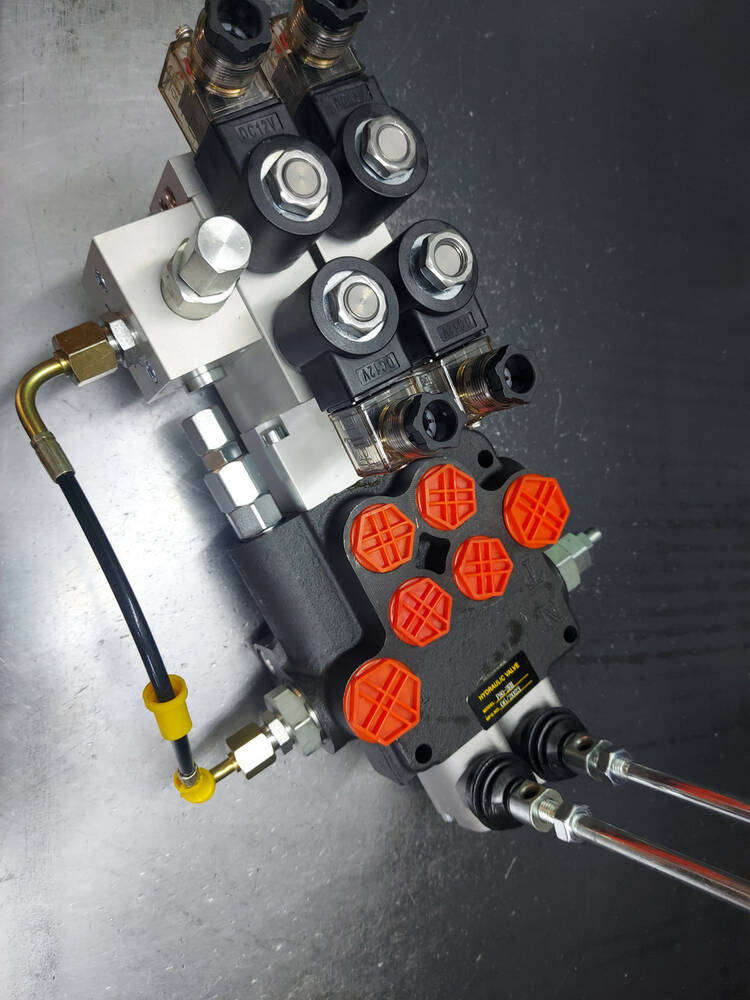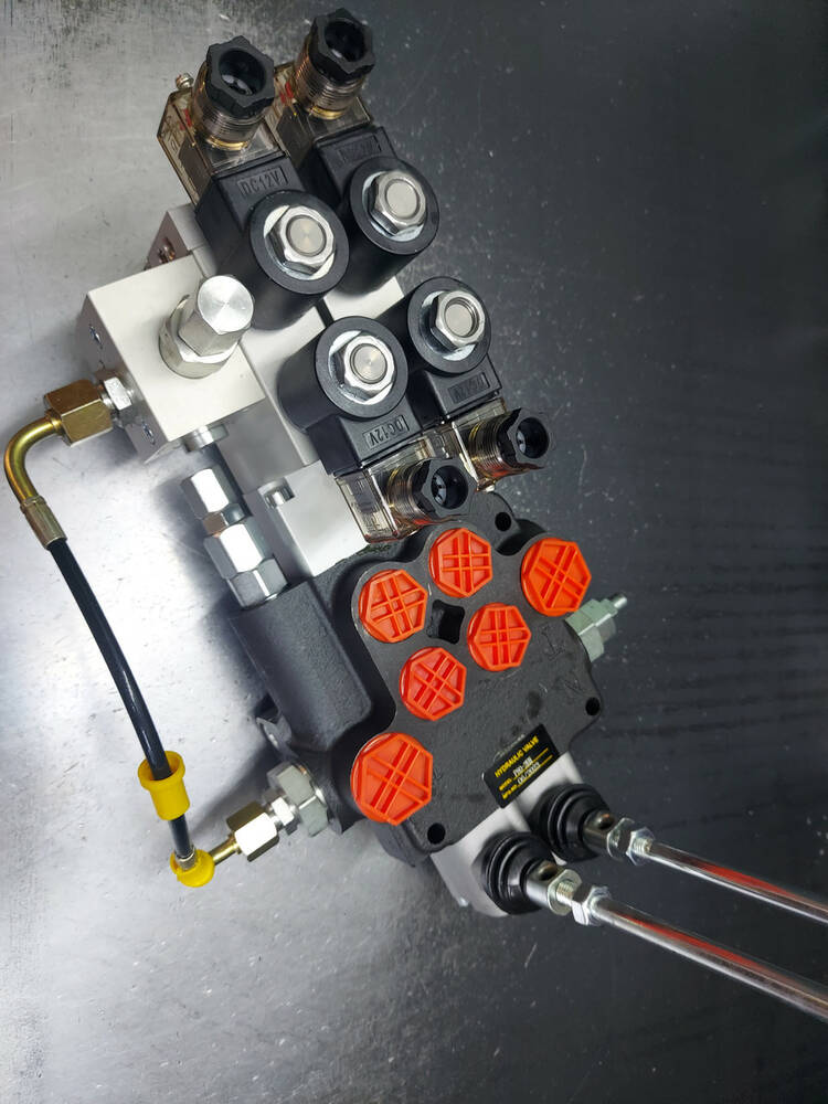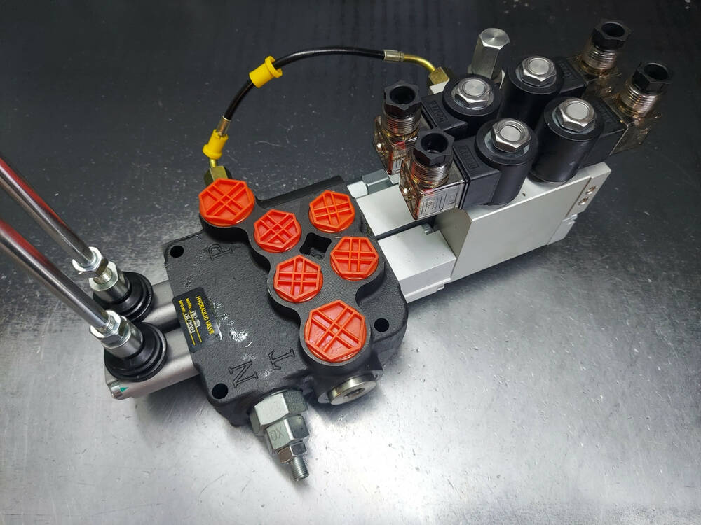 Гідророзподільник 2 секційний з гідроелектрокеруванням (електрокероване керування 12/24 В + механічне дублювання за допомогою важеля) з номінальною подачею оливи 80-90 л/хв імпортного виробництва Корея. Найкраща ціна в Україні, від прямого постачальника гідравліки, гарантія на всю гідравліку.
