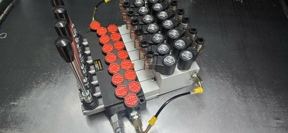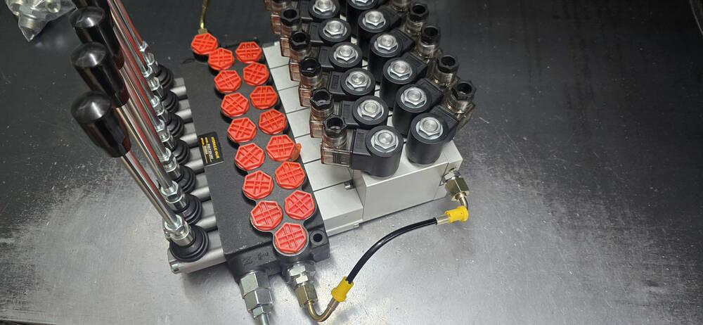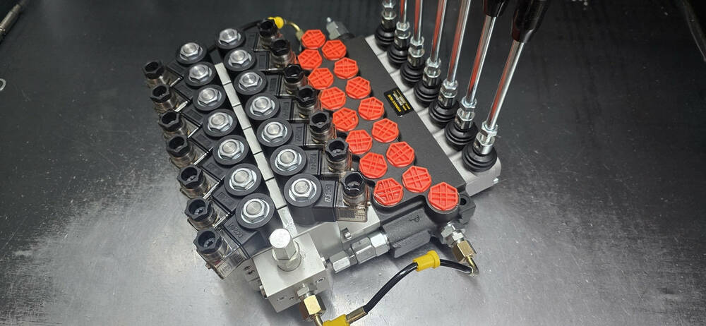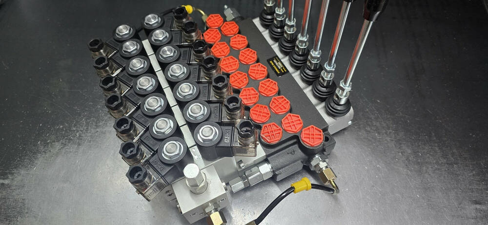 Гідророзподільник 7-секційний з гідроелектрокеруванням (електрокерування 12/24 В + механічне дублювання за допомогою важеля) з номінальною подачею олії від 40-50 л/хв імпортного виробництва Корея. Найкраща ціна в Україні, від прямого постачальника гідравліки, гарантія на всю гідравліку.